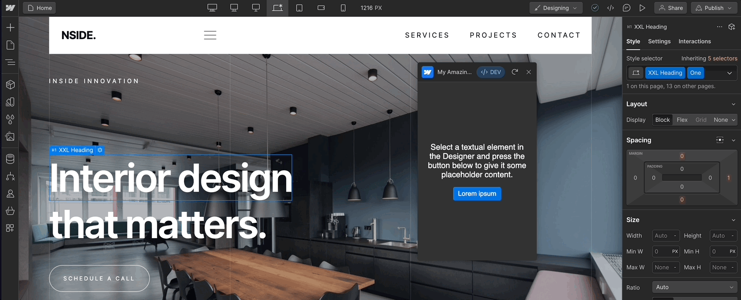 The starter project you created already includes a basic example of using the Designer APIs: when you select a text element in the Webflow Designer and click the “Lorem Ipsum” button in your extension, the selected element’s text is replaced with placeholder content.