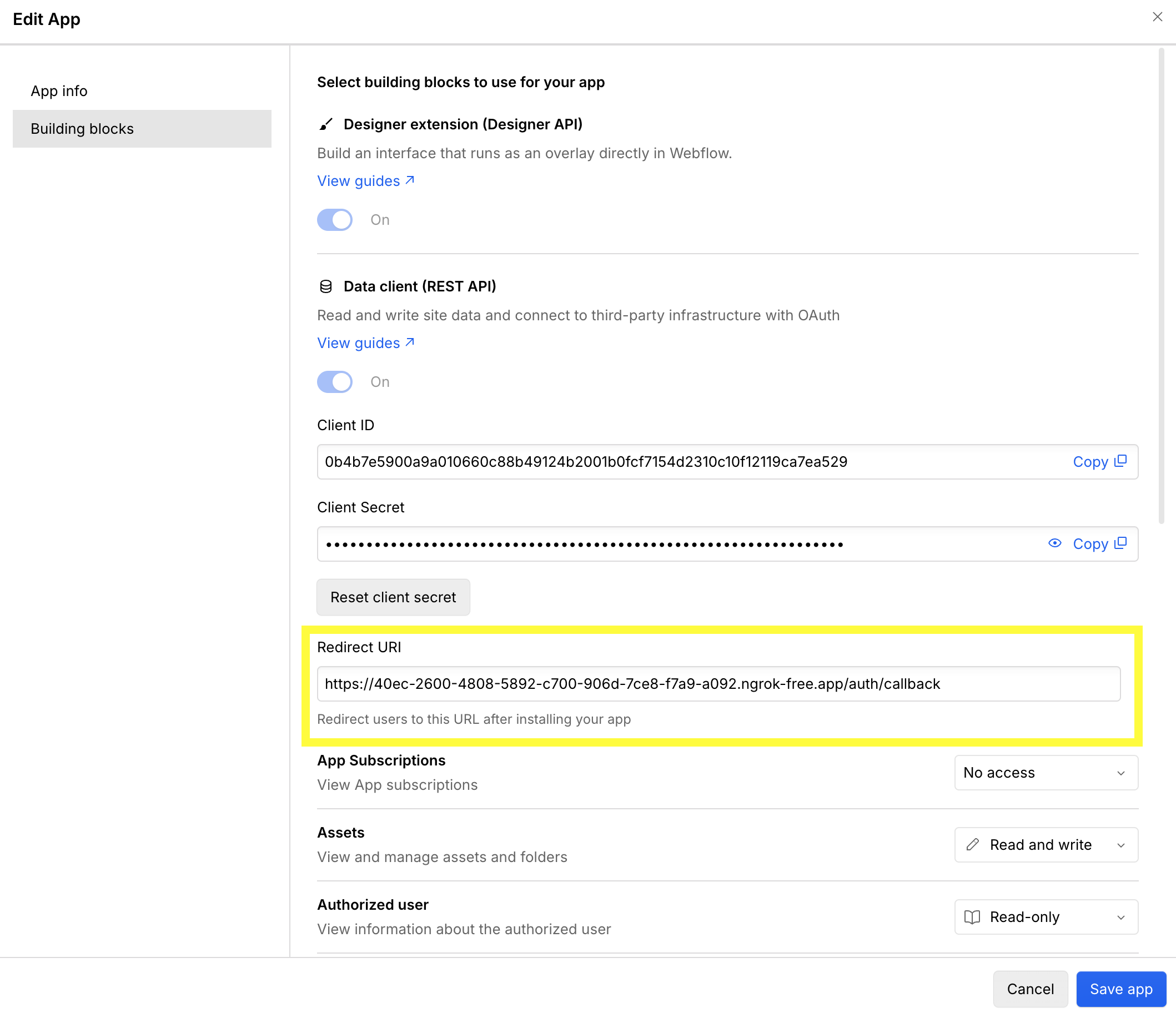 Copy the redirect URI from your terminal output. Navigate to your App in the Webflow Dashboard Settings and update the Redirect URI to the URL of your server.