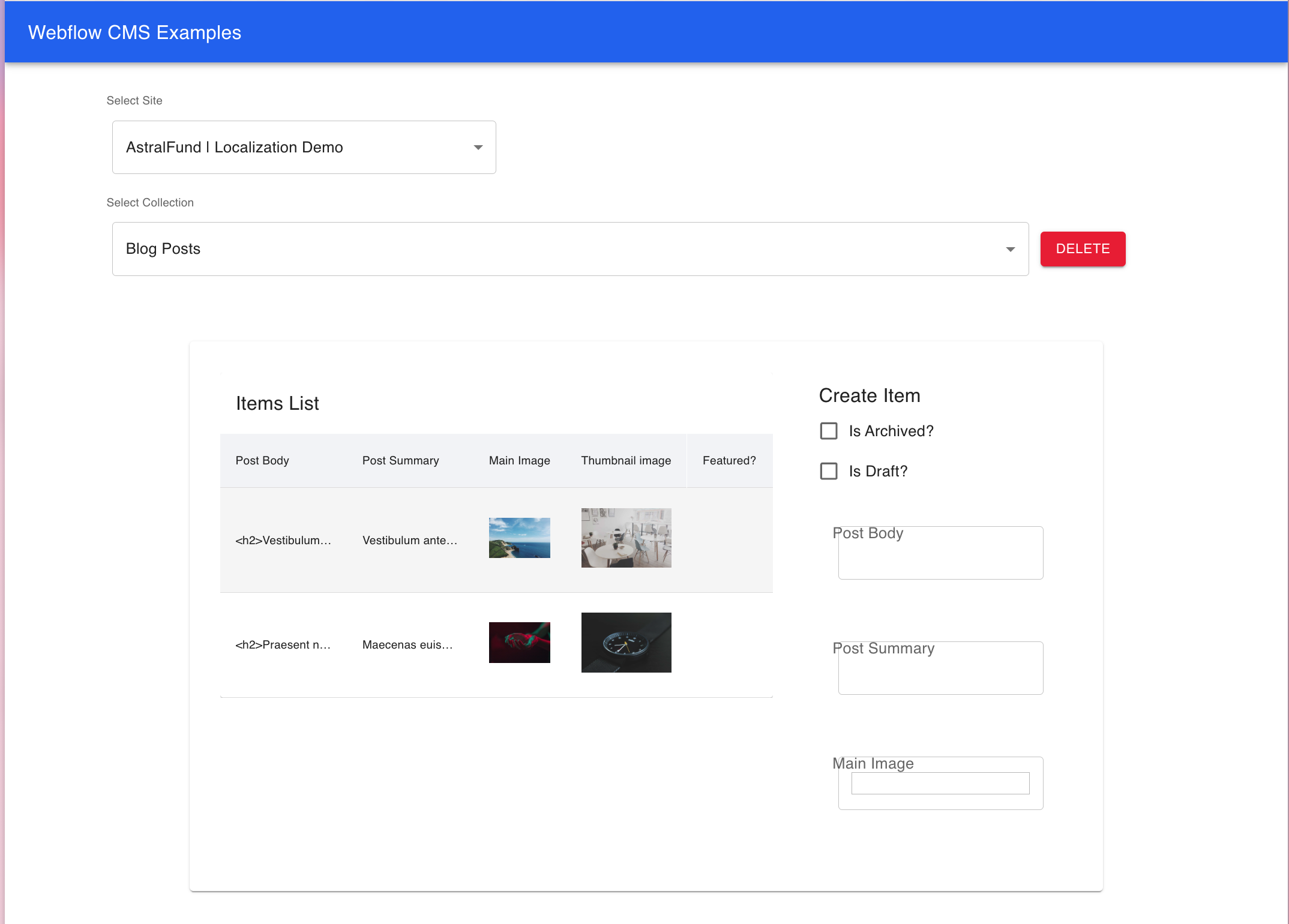 Reference the starter code for to follow along with the guide. This code already takes care of the OAuth Handshake and initializes the Webflow Client as shown in the Authentication guide. You’ll be able to start this App, authenticate the App, and start making requests to the Webflow CMS API.