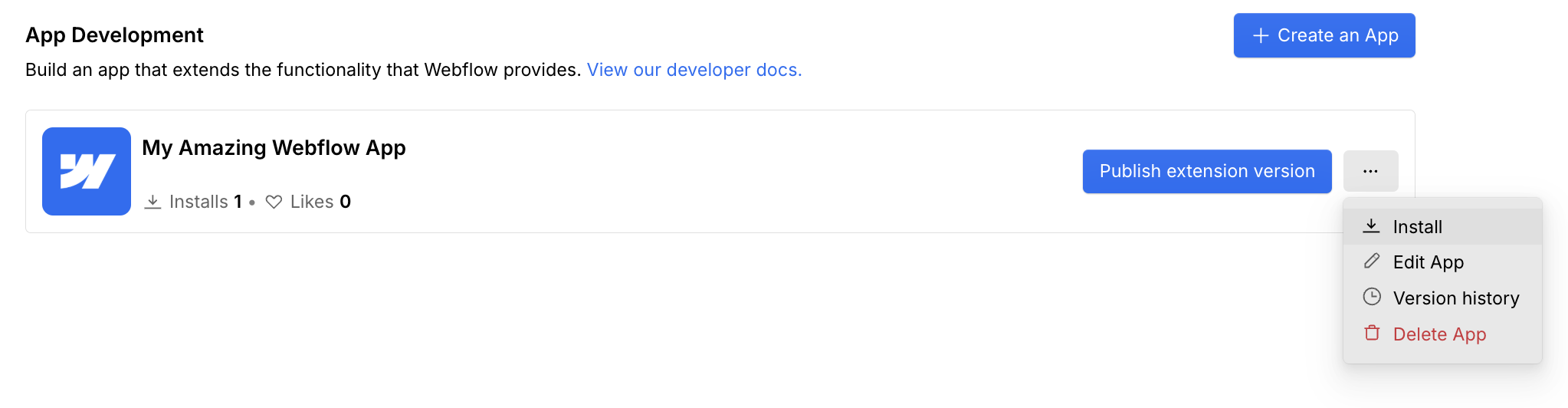 In your Workspace Settings, navigate to the “Apps & Integrations” > “Develop” section. Find your App and select the ”…” button. Click “Install” and follow the instructions to install your extension to your test site.