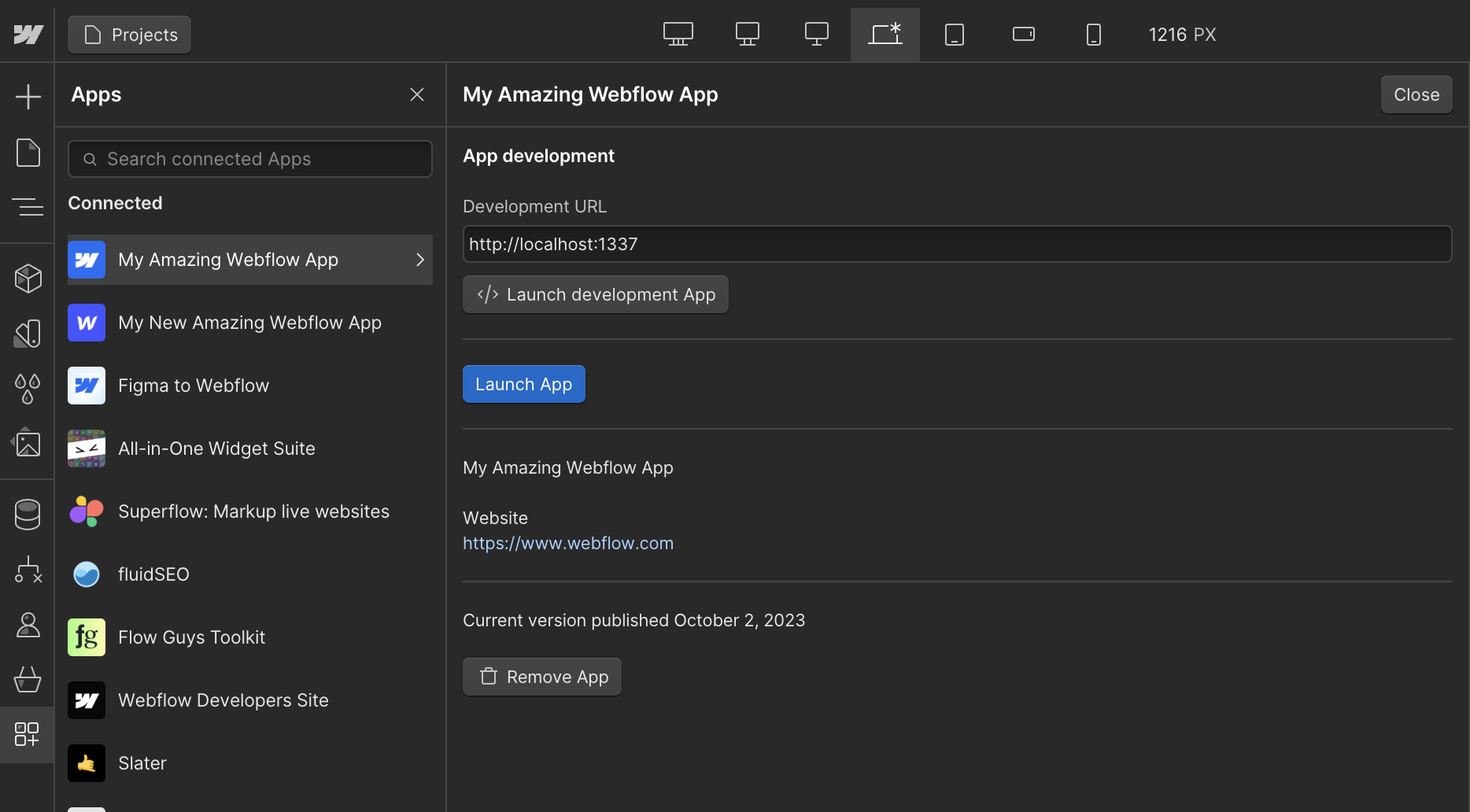 Open your test site in the Webflow Designer, and press the “E” key to open the app panel. Find your app and click “Launch development app” to see your extension running in the Webflow Designer.